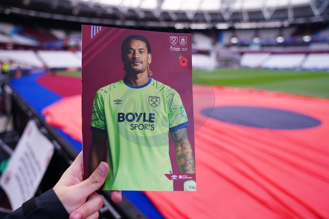 View of Areola of West Ham on the front of the matchday programme ahead of the Premier League match West Ham United vs Burnley at London Stadium, London, United Kingdom, 8th November 2025, Credit:Harvey Murphy/News Images / Avalon