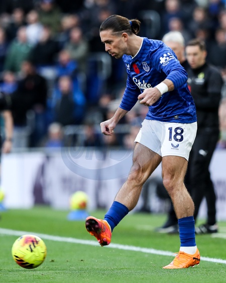 Jack Grealish of Everton passes the ball during the Premier League match Everton vs Fulham at Hill Dickinson Stadium, Liverpool, United Kingdom, 8th November 2025, Credit:Jorge Horsted/News Images / Avalon