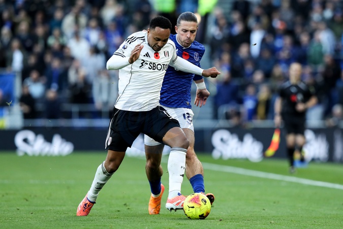 Jack Grealish of Everton tackles Kenny Tete of Fulham during the Premier League match Everton vs Fulham at Hill Dickinson Stadium, Liverpool, United Kingdom, 8th November 2025, Credit:Jorge Horsted/News Images / Avalon