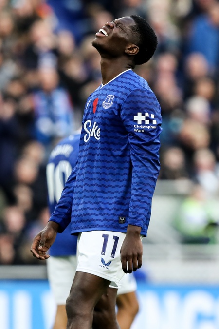 Thierno Barry of Everton dejected as his goal is ruled offside during the Premier League match Everton vs Fulham at Hill Dickinson Stadium, Liverpool, United Kingdom, 8th November 2025, Credit:Jorge Horsted/News Images / Avalon