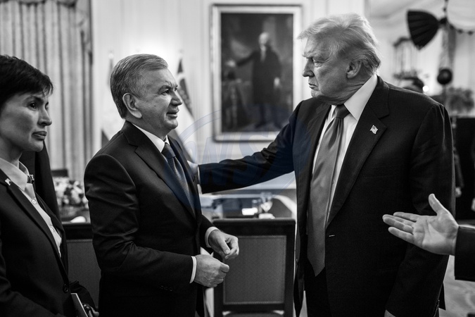 President Donald Trump speaks with the President of the Republic of Uzbkeistan Shavkat Mirziyoyev after a dinner with leaders of C5 Central Asian countries in the East Room of the White House, Thursday, November 6, 2025., Credit:Daniel Torok / Avalon