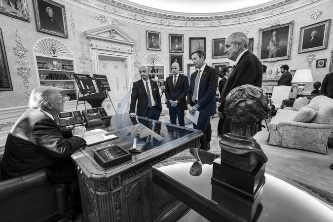 President Donald Trump speaks with pharmaceutical representatives before a press conference announcing the lowering of drug prices in the Oval Office, Thursday, November 6, 2025., Credit:Abe McNatt / Avalon
