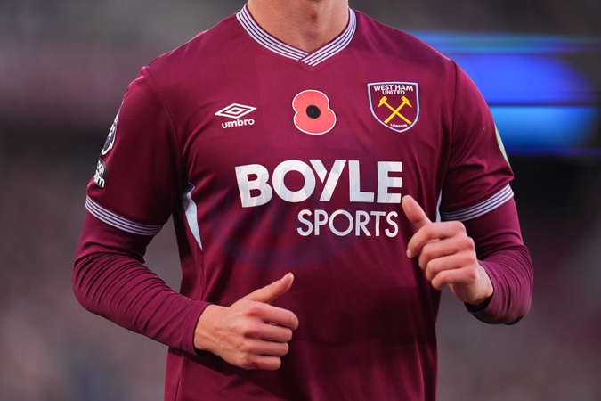 Close up view of Poppy on West Ham home shirt during the Premier League match West Ham United vs Burnley at London Stadium, London, United Kingdom, 8th November 2025, Credit:Harvey Murphy/News Images / Avalon