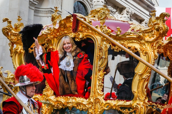 London, UK. 08th Nov, 2025. The New Lady Mayor, Dame Susan Langley DBE, rides in the gilded State Coach from Guildhall Yard to Mansion House before the procession. For the first time in its 800-year history, the Lord Mayor's Show becomes the Lady Mayor's Show, a historic milestone for the City of London. Dame Susan is the third woman to hold the role, but the first to adopt the title "Lady Mayor.", Credit:Imageplotter / Avalon