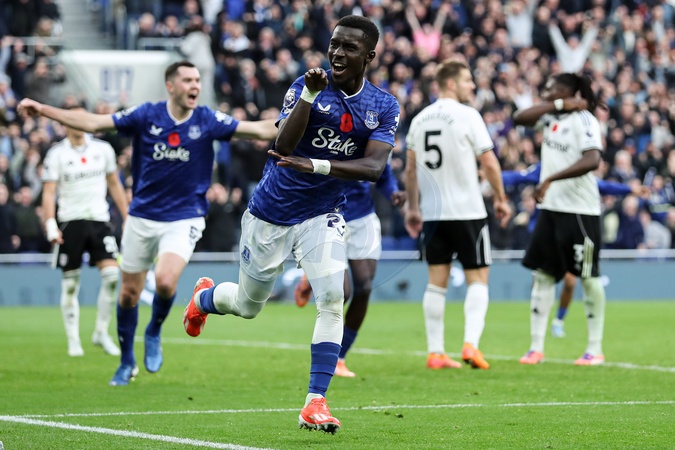 Idrissa Gueye of Everton scores and celebrates goal to make it 1-0 during the Premier League match Everton vs Fulham at Hill Dickinson Stadium, Liverpool, United Kingdom, 8th November 2025, Credit:Jorge Horsted/News Images / Avalon