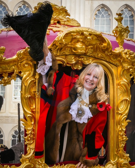 London, UK. 08th Nov, 2025. The New Lady Mayor, Dame Susan Langley DBE, rides in the gilded State Coach from Guildhall Yard to Mansion House before the procession. For the first time in its 800-year history, the Lord Mayor's Show becomes the Lady Mayor's Show, a historic milestone for the City of London. Dame Susan is the third woman to hold the role, but the first to adopt the title "Lady Mayor.", Credit:Imageplotter / Avalon