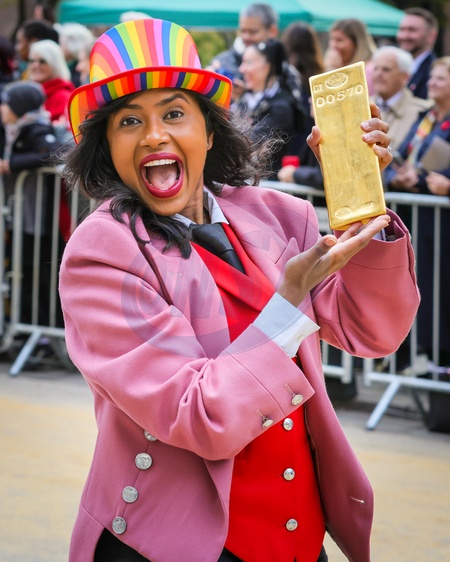 London, UK. 08th Nov, 2025. Participants with the Bank of England wave and smile. The three-mile long procession showcases tradition, pageantry, as well as the modern City of London with military bands, livery companies, community groups, charities and others, featuring around 7, 000 participants, 200 horses and over 50 decorated floats. For the first time in its 800 year history, the procession is called Lady Mayor's Show as the new Lady Mayor, Dame Susan Langley DBE, is welcomed to the City of London., Credit:Imageplotter / Avalon