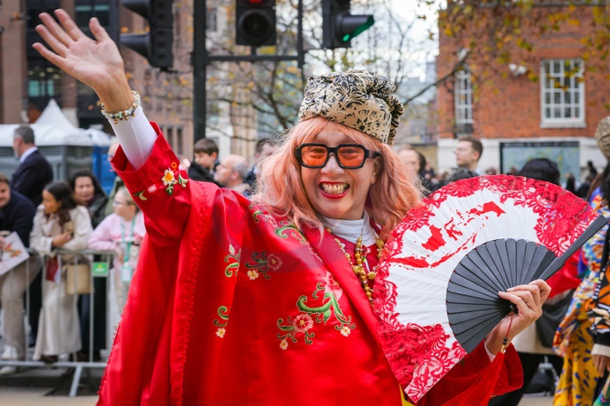 London, UK. 08th Nov, 2025. Participants from a Chinese group wave and smile. The three-mile long procession showcases tradition, pageantry, as well as the modern City of London with military bands, livery companies, community groups, charities and others, featuring around 7, 000 participants, 200 horses and over 50 decorated floats. For the first time in its 800 year history, the procession is called Lady Mayor's Show as the new Lady Mayor, Dame Susan Langley DBE, is welcomed to the City of London., Credit:Imageplotter / Avalon