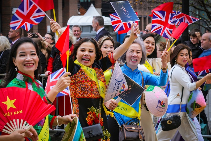London, UK. 08th Nov, 2025. Participants from an ANSEA group wave and smile. The three-mile long procession showcases tradition, pageantry, as well as the modern City of London with military bands, livery companies, community groups, charities and others, featuring around 7, 000 participants, 200 horses and over 50 decorated floats. For the first time in its 800 year history, the procession is called Lady Mayor's Show as the new Lady Mayor, Dame Susan Langley DBE, is welcomed to the City of London., Credit:Imageplotter / Avalon