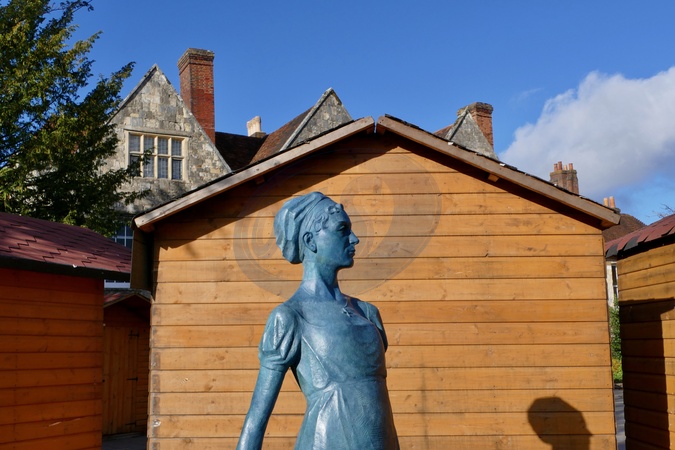A new life-sized sculpture of author Jane Austen has been unveiled in the grounds of Winchester Cathedral to commemorate the 250th anniversary of the writer's birth.The hugely popular author of novels including Pride and Prejudice was born in the village of Steventon near Basingstoke in 1775.She died at a house in College Street, Winchester, in 1817 and is buried in the cathedral. The new statue, shows Jane Austen by her writing table and is the work of the artist Martin Jennings., Credit:Geoffrey Swaine / Avalon