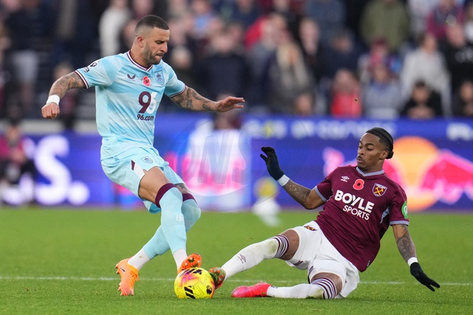 Crysencio Summerville of West Ham United slides in on Kyle Walker of Burnley during the Premier League match West Ham United vs Burnley at London Stadium, London, United Kingdom, 8th November 2025, Credit:Harvey Murphy/News Images / Avalon