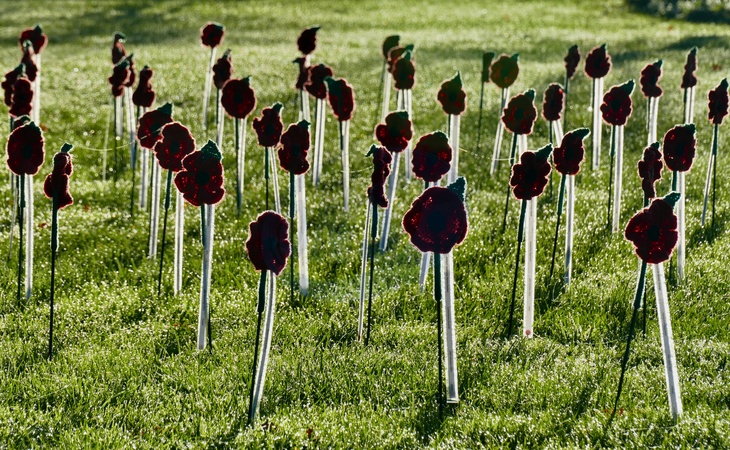 A field of knitted poppies in the war memorial gardens. Knitted poppies are on display in Romsey Abbey, The War Memorial Gardens, the War Memorial Statue and post boxes around the Hampshire market town in preparations for Sundays Remembrance Day Services., Credit:Geoffrey Swaine / Avalon