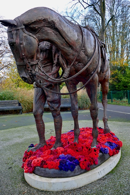 The Romsey War Horse Sculpture is decorated with a sheath of knitted poppies. Knitted poppies are on display in Romsey Abbey, The War Memorial Gardens, the War Memorial Statue and post boxes around the Hampshire market town in preparations for Sundays Remembrance Day Services., Credit:Geoffrey Swaine / Avalon