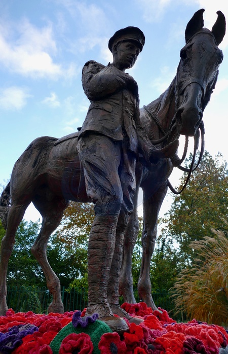 The Romsey War Horse Sculpture is decorated with a sheath of knitted poppies. Knitted poppies are on display in Romsey Abbey, The War Memorial Gardens, the War Memorial Statue and post boxes around the Hampshire market town in preparations for Sundays Remembrance Day Services., Credit:Geoffrey Swaine / Avalon