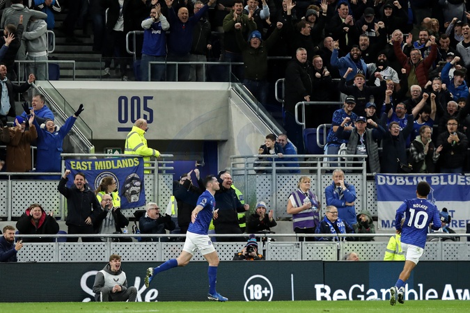Michael Keane of Everton scores and celebrates after making it 2-0 during the Premier League match Everton vs Fulham at Hill Dickinson Stadium, Liverpool, United Kingdom, 8th November 2025, Credit:Jorge Horsted/News Images / Avalon
