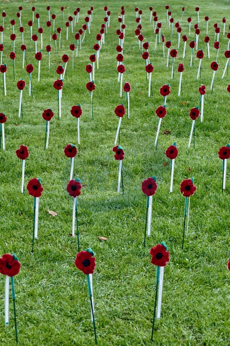 A field of knitted poppies in the war memorial gardens. Knitted poppies are on display in Romsey Abbey, The War Memorial Gardens, the War Memorial Statue and post boxes around the Hampshire market town in preparations for Sundays Remembrance Day Services., Credit:Geoffrey Swaine / Avalon