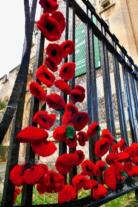 Knitted poppies at a church. Knitted poppies are on display in Romsey Abbey, The War Memorial Gardens, the War Memorial Statue and post boxes around the Hampshire market town in preparations for Sundays Remembrance Day Services., Credit:Geoffrey Swaine / Avalon