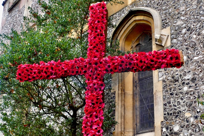 Knitted poppies at a church. Knitted poppies are on display in Romsey Abbey, The War Memorial Gardens, the War Memorial Statue and post boxes around the Hampshire market town in preparations for Sundays Remembrance Day Services., Credit:Geoffrey Swaine / Avalon