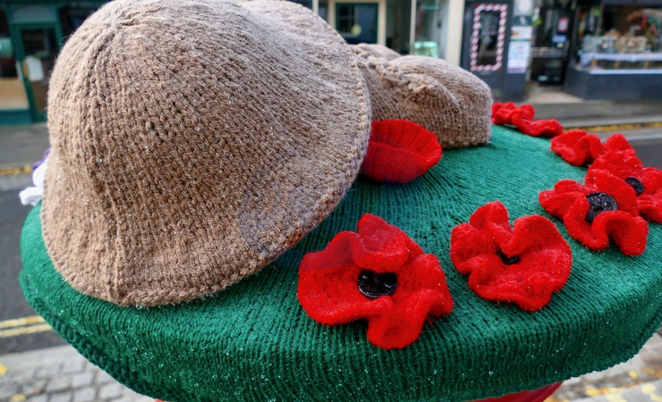 A war themed post box topper on an out of service post box. Knitted poppies are on display in Romsey Abbey, The War Memorial Gardens, the War Memorial Statue and post boxes around the Hampshire market town in preparations for Sundays Remembrance Day Services., Credit:Geoffrey Swaine / Avalon