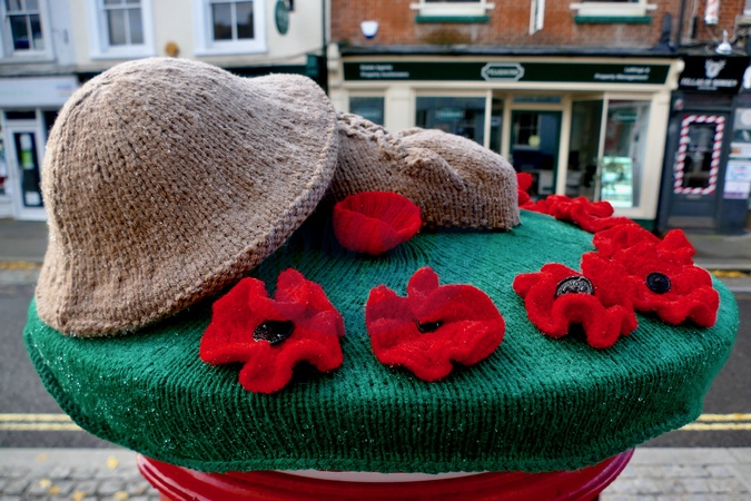 A war themed post box topper on an out of service post box. Knitted poppies are on display in Romsey Abbey, The War Memorial Gardens, the War Memorial Statue and post boxes around the Hampshire market town in preparations for Sundays Remembrance Day Services., Credit:Geoffrey Swaine / Avalon