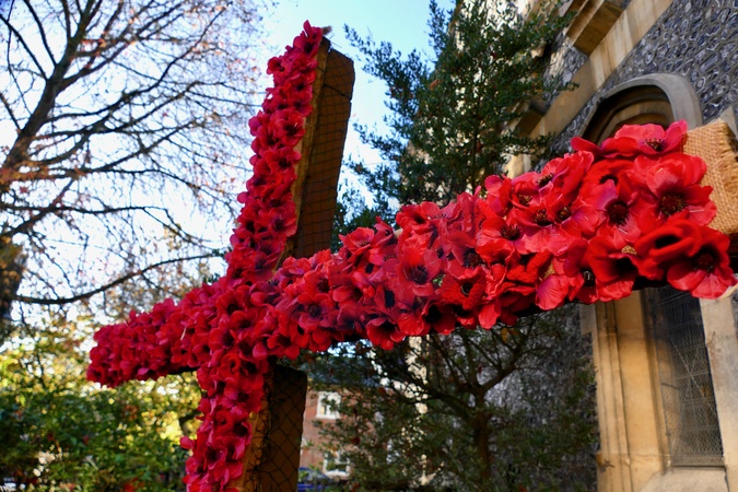 Knitted poppies at a church. Knitted poppies are on display in Romsey Abbey, The War Memorial Gardens, the War Memorial Statue and post boxes around the Hampshire market town in preparations for Sundays Remembrance Day Services., Credit:Geoffrey Swaine / Avalon