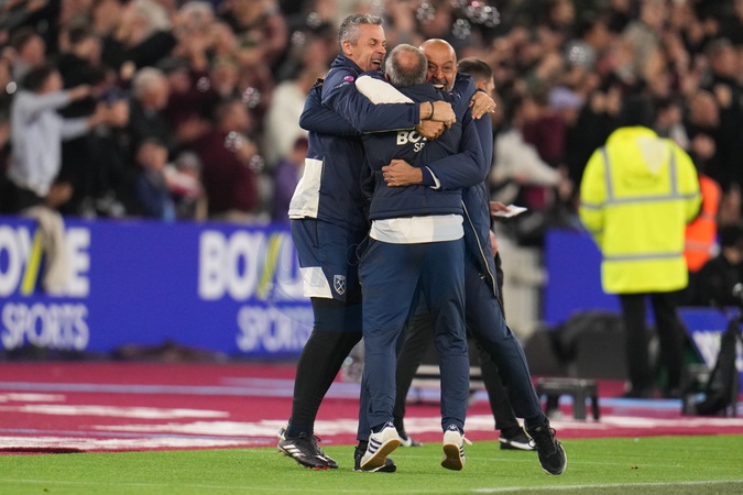 Nuno Espirito Santo manager of West Ham United and his staff celebrate goal to make it 3-1 during the Premier League match West Ham United vs Burnley at London Stadium, London, United Kingdom, 8th November 2025, Credit:Harvey Murphy/News Images / Avalon