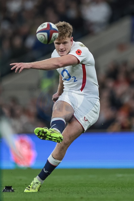 Fin Smith of England converts for a goal during the Quilter Nations Series 2025 match England vs Fiji at Allianz Stadium, Twickenham, United Kingdom, 8th November 2025, Credit:Mark Cosgrove/News Images / Avalon
