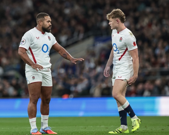 Ollie Lawrence of England speaks to Fin Smith of England during the Quilter Nations Series 2025 match England vs Fiji at Allianz Stadium, Twickenham, United Kingdom, 8th November 2025, Credit:Mark Cosgrove/News Images / Avalon