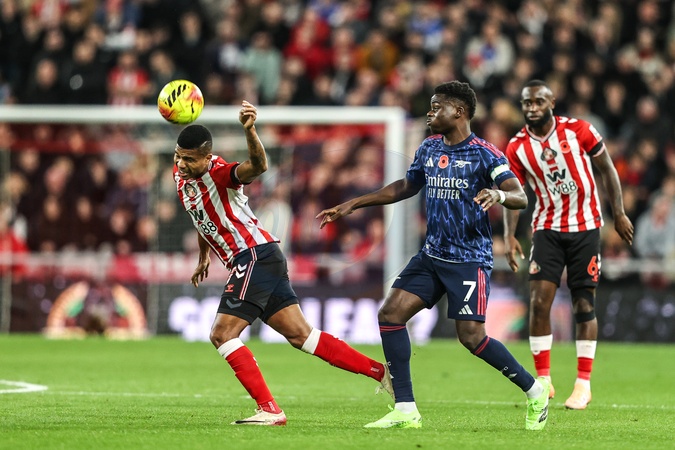 Jenson Seelt of Sunderland heads the ball under pressure from Bukayo Saka of Arsenal during the Premier League match Sunderland vs Arsenal at Stadium Of Light, Sunderland, United Kingdom, 8th November 2025, Credit:Ae Cosgrove/News Images / Avalon