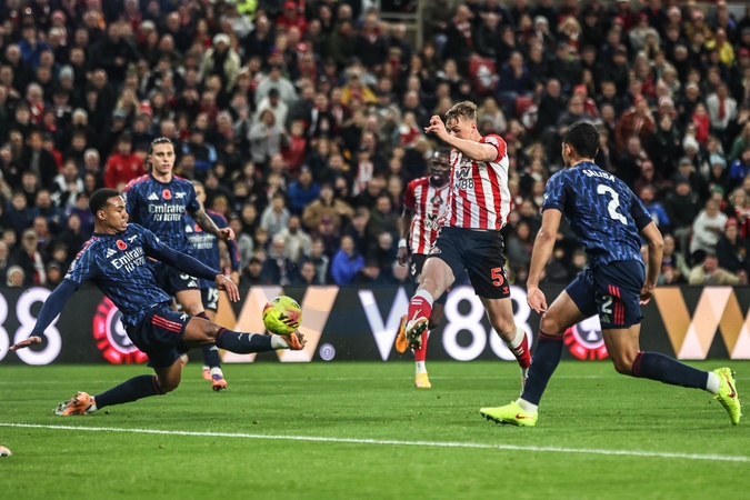 Daniel Ballard of Sunderland scores to make it 1-0 during the Premier League match Sunderland vs Arsenal at Stadium Of Light, Sunderland, United Kingdom, 8th November 2025, Credit:Ae Cosgrove/News Images / Avalon