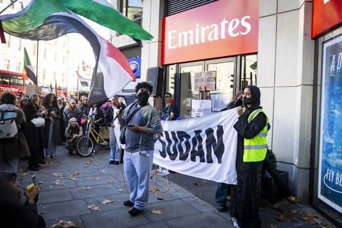 Sudanese activists and supporters gathered in Central London to protest against atrocities committed by the Rapid Support Forces (RSF) following their capture of Al Fashir from government forces. Demonstrators condemned the recent massacres and called for international intervention to stop the ongoing violence. Protesters waved Sudanese flags, chanted for peace and justice, and demanded accountability for war crimes committed in the Darfur region., Credit:Zak Irfan / Avalon
