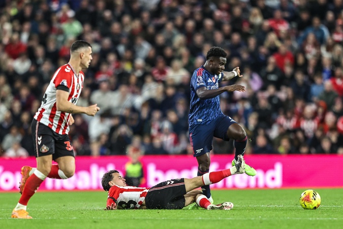 Enzo Le Fée of Sunderland and Bukayo Saka of Arsenal battle for the ball during the Premier League match Sunderland vs Arsenal at Stadium Of Light, Sunderland, United Kingdom, 8th November 2025, Credit:Ae Cosgrove/News Images / Avalon