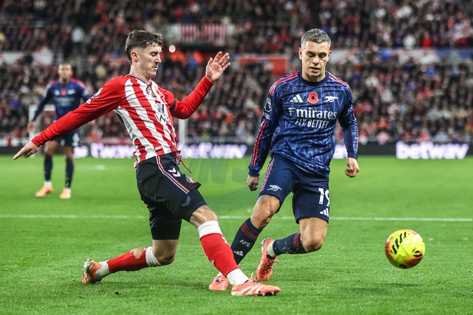 Trai Hume of Sunderland and Leandro Trossard of Arsenal battle for the ball during the Premier League match Sunderland vs Arsenal at Stadium Of Light, Sunderland, United Kingdom, 8th November 2025, Credit:Ae Cosgrove/News Images / Avalon