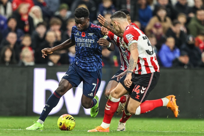 Bukayo Saka of Arsenal breaks with the ball under pressure from GranitXhaka of Sunderland and Reinildo Mandava of Sunderland during the Premier League match Sunderland vs Arsenal at Stadium Of Light, Sunderland, United Kingdom, 8th November 2025, Credit:Ae Cosgrove/News Images / Avalon
