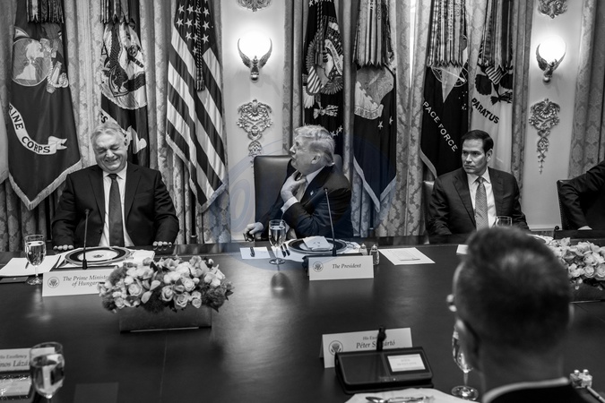 President Donald Trump laughs with Hungarian Prime Minister Viktor Orban during a bilateral meeting in the Cabinet Room, Friday, November 7, 2025., Credit:Daniel Torok / Avalon