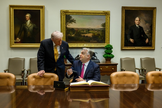 Hungarian Prime Minister Viktor Orban speaks with President Donald Trump before signing the guest book in the Roosevelt Room of the White House, Friday, November 7, 2025., Credit:Daniel Torok / Avalon