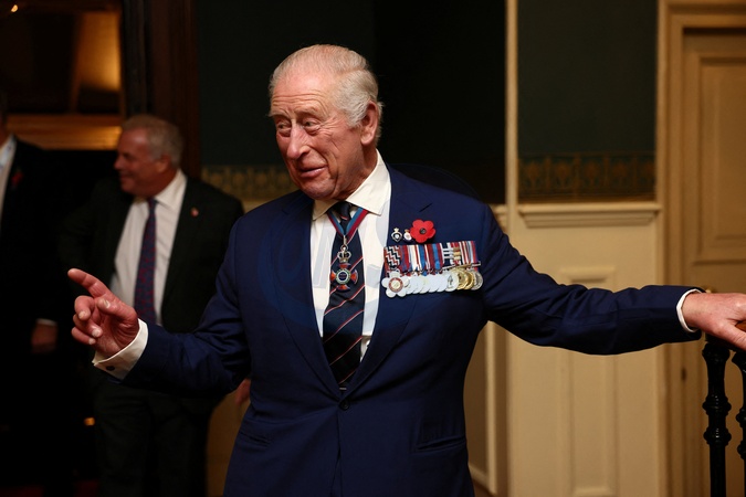 Britain's King Charles gestures as he arrives at the Royal Albert Hall for the Royal British Legion Festival of Remembrance, an annual event honouring military service members, which holds special significance in 2025 as it marks the 80th anniversary of the end of World War Two, at the Royal Albert Hall in London, Britain, November 8, 2025., Credit:Jack Taylor / Avalon