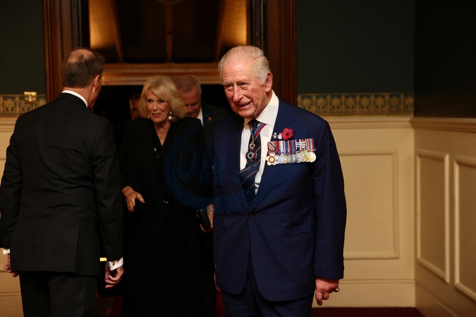 Britain's King Charles and Queen Camilla arrive at the Royal Albert Hall for the Royal British Legion Festival of Remembrance, an annual event honouring military service members, which holds special significance in 2025 as it marks the 80th anniversary of the end of World War Two, at the Royal Albert Hall in London, Britain, November 8, 2025., Credit:Jack Taylor / Avalon
