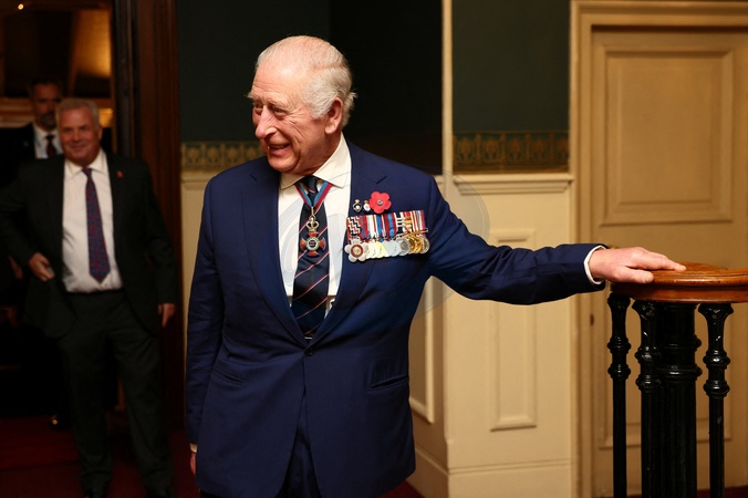 Britain's King Charles reacts as he arrives at the Royal Albert Hall for the Royal British Legion Festival of Remembrance, an annual event honouring military service members, which holds special significance in 2025 as it marks the 80th anniversary of the end of World War Two, at the Royal Albert Hall in London, Britain, November 8, 2025., Credit:Jack Taylor / Avalon