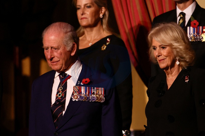 Britain's King Charles, Queen Camilla, and Sophie, Duchess of Edinburgh, stand during the Royal British Legion Festival of Remembrance, an annual event honouring military service members, which holds special significance in 2025 as it marks the 80th anniversary of the end of World War Two, at the Royal Albert Hall in London, Britain, November 8, 2025., Credit:Jack Taylor / Avalon