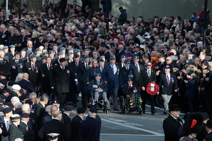 LONDON, ENGLAND - NOVEMBER 09: A general view of the veterans' parade during the 2025 National Service Of Remembrance at The Cenotaph on November 09, 2025 in London, England. Every year, members of the British Royal Family join politicians, veterans and members of the public to remember those who have died in combat., Credit:Chris Jackson / Avalon