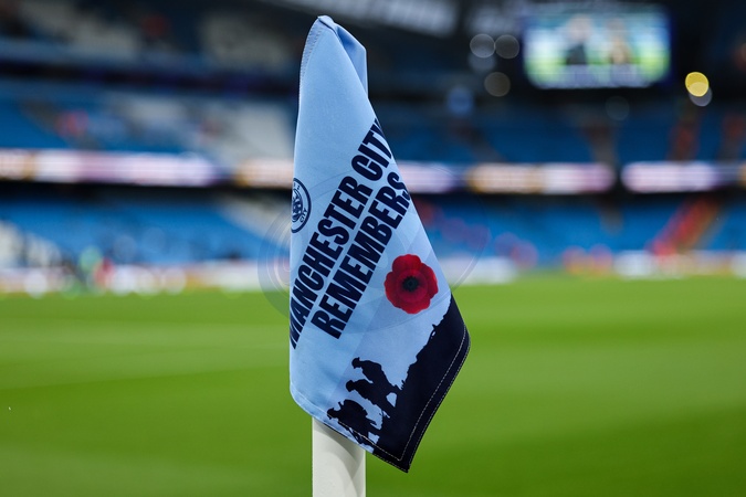 Manchester City corner flag showing remembrance poppy ahead of the Premier League match Manchester City vs Liverpool at Etihad Stadium, Manchester, United Kingdom, 9th November 2025, Credit:Mark Cosgrove/News Images / Avalon