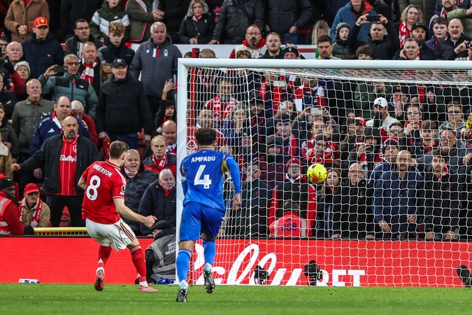 Elliot Anderson of Nottingham Forest scores a penalty to make it 3-1 during the Premier League match Nottingham Forest vs Leeds United at City Ground, Nottingham, United Kingdom, 9th November 2025, Credit:Ae Cosgrove/News Images / Avalon