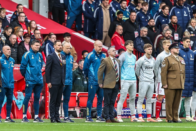 Sean Dyche manager of Nottingham Forest and the staff have a minutes silence for Remembrance Day during the Premier League match Nottingham Forest vs Leeds United at City Ground, Nottingham, United Kingdom, 9th November 2025, Credit:Ae Cosgrove/News Images / Avalon