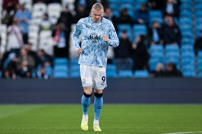Erling Haaland of Manchester City warms up ahead of the Premier League match Manchester City vs Liverpool at Etihad Stadium, Manchester, United Kingdom, 9th November 2025, Credit:Mark Cosgrove/News Images / Avalon