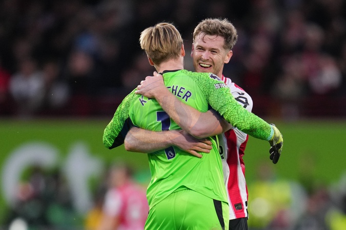 Nathan Collins of Brentford and Caoimhín Kelleher of Brentford celebrate 3-1 lead during the Premier League match Brentford vs Newcastle United at The Gtech Community Stadium, London, United Kingdom, 9th November 2025, Credit:Harvey Murphy/News Images / Avalon