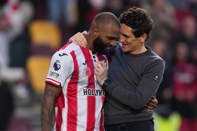 Igor Thiago of Brentford and Keith Andrews manager of Brentford at full time during the Premier League match Brentford vs Newcastle United at The Gtech Community Stadium, London, United Kingdom, 9th November 2025, Credit:Harvey Murphy/News Images / Avalon