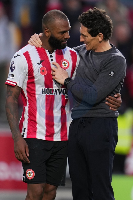 Igor Thiago of Brentford and Keith Andrews manager of Brentford at full time during the Premier League match Brentford vs Newcastle United at The Gtech Community Stadium, London, United Kingdom, 9th November 2025, Credit:Harvey Murphy/News Images / Avalon