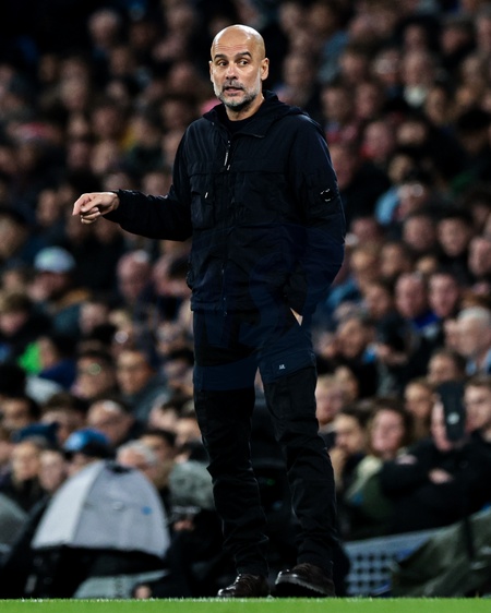 Pep Guardiola Manchester City manager gives instructions to his team during the Premier League match Manchester City vs Liverpool at Etihad Stadium, Manchester, United Kingdom, 9th November 2025, Credit:Mark Cosgrove/News Images / Avalon
