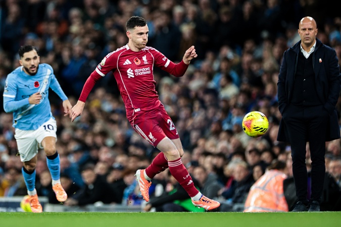 Andrew Robertson of Liverpool with ball at his feet during the Premier League match Manchester City vs Liverpool at Etihad Stadium, Manchester, United Kingdom, 9th November 2025, Credit:Mark Cosgrove/News Images / Avalon